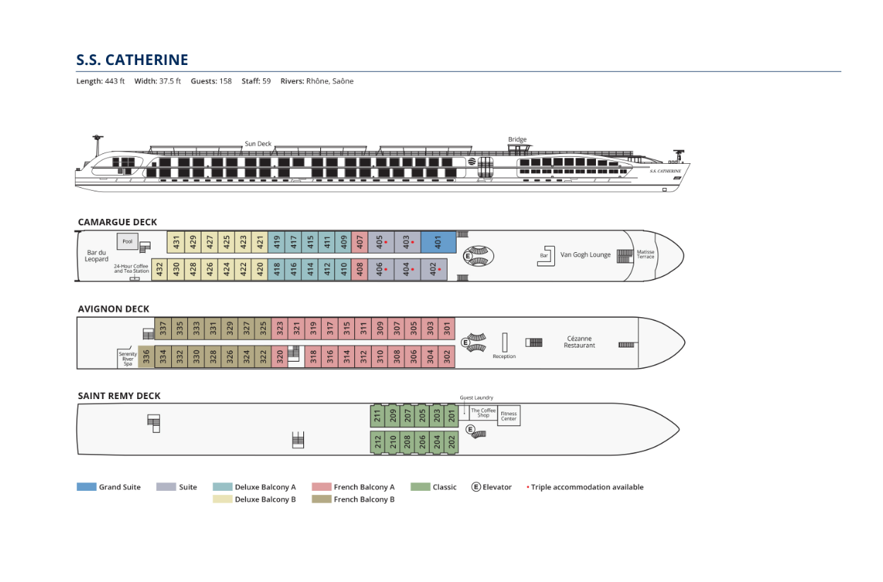 Deluxe Balcony staterooms and Suites on the Camargue Deck have balconies with floor-to-ceiling windows that, with the touch of a button, will raise the glass to create a completely enclosed conservatory. Lavishly appointed riverview staterooms and suites have handcrafted Savoir® Beds of England, custom cotton sateen sheets and European duvets, and a menu of pillow options.